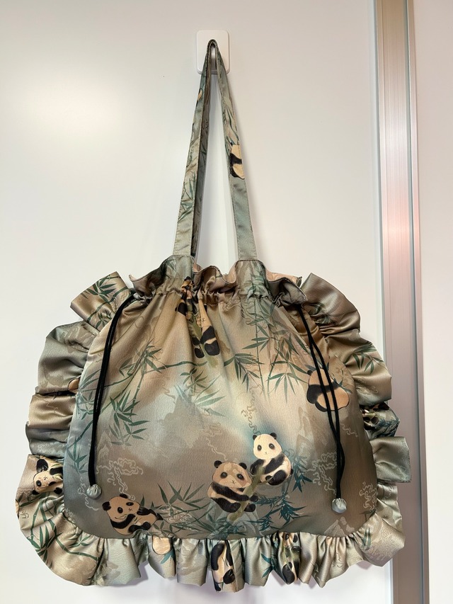 大きめのきんちゃくバッグにフリルで華やか&大胆にかっこかわいいです。 普通のトートと違って上が絞れるので安心感あり。もちろん絞らずに広げたまま普通のトートとして使ってもOK。 大人っぽいサテン素材なのにパンダ柄というミスマッチがかわいい! 色味はグリーン系ですが、玉虫色って感じで角度によってオレンジっぽかったりピンクがかって見えたりするので、意外と合わせる服の色を選びませんよ♪ 縦33×横38㎝(フリル含まず) フリル幅約5㎝ 持ち手57約㎝ 海外製の生地は作りが荒いです。ところどころカスレ、プリントずれ、ネップなどありますが、生地の特徴のひとつです。それも味としてお楽しみください。 ポンポンは繊細なつくりとなっております。ひっかけにご注意のうえお洗濯は手洗いで優しく洗ってください。また初めのうちは色落ちの可能性がありますので単独で洗ってください。