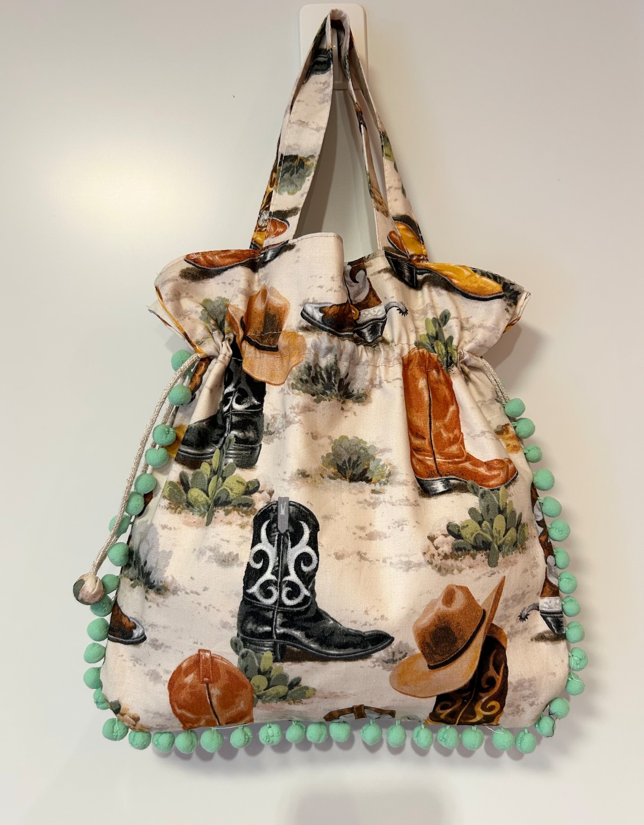 ウエスタンブーツ柄にあえてミントブルーのポンポンを付けて、ポップさをだしてみました!
