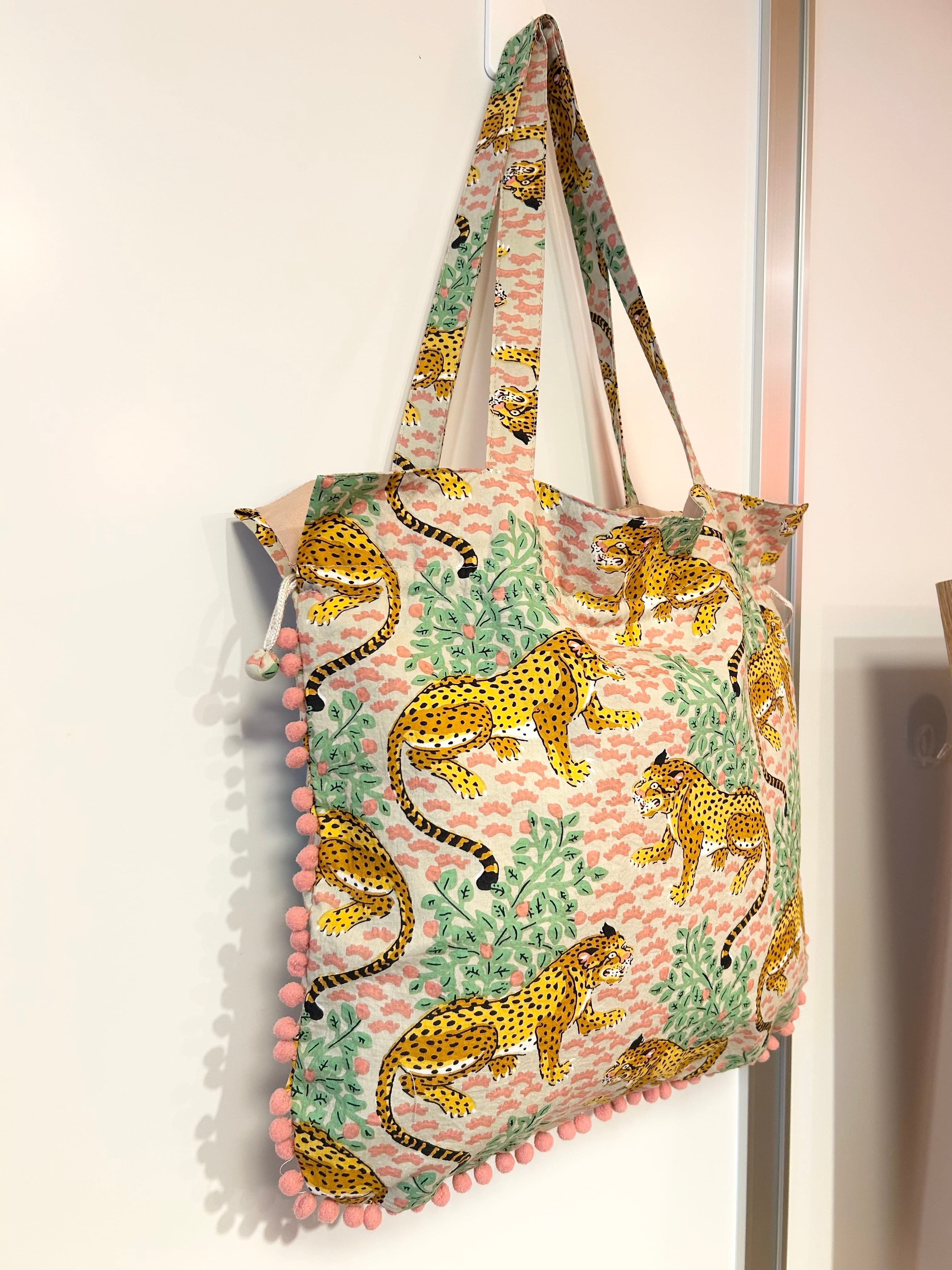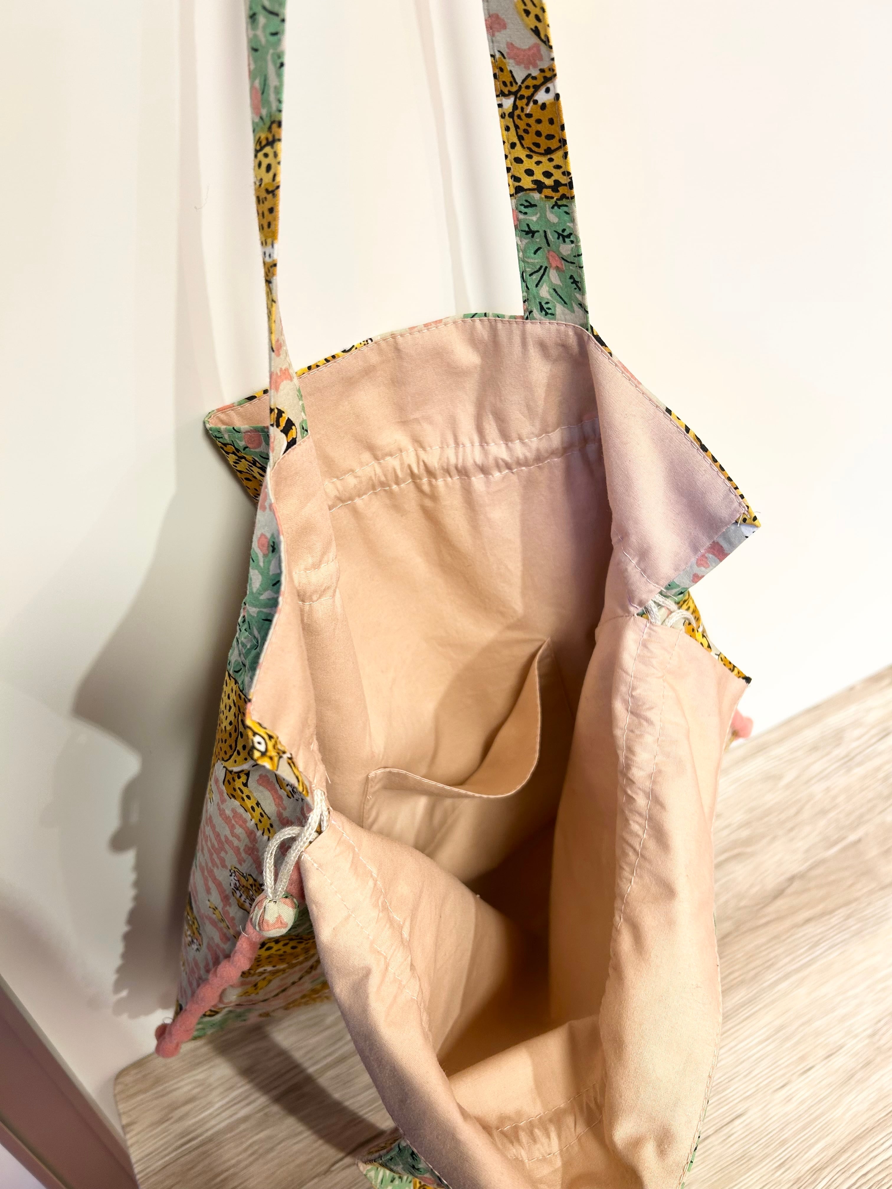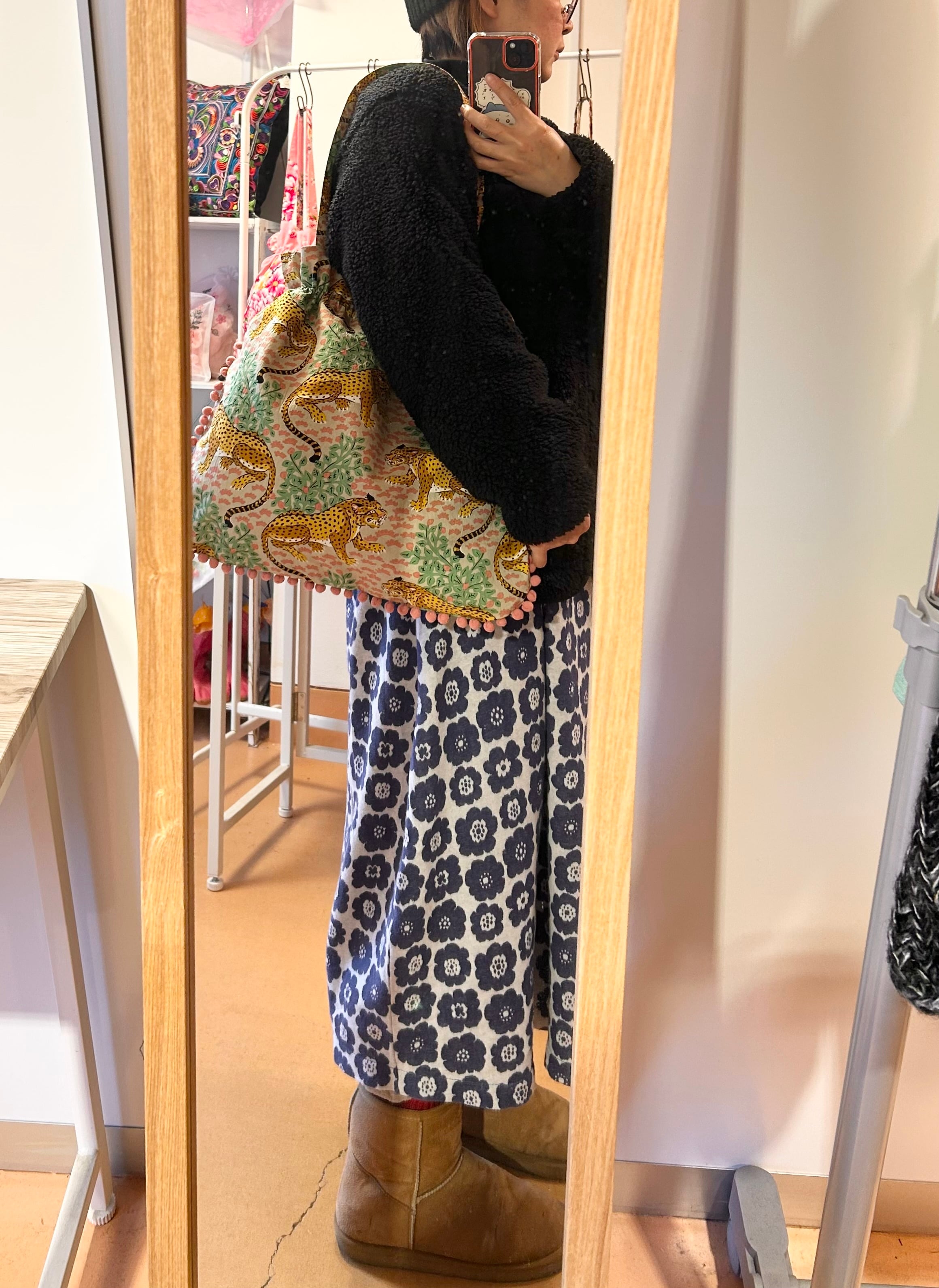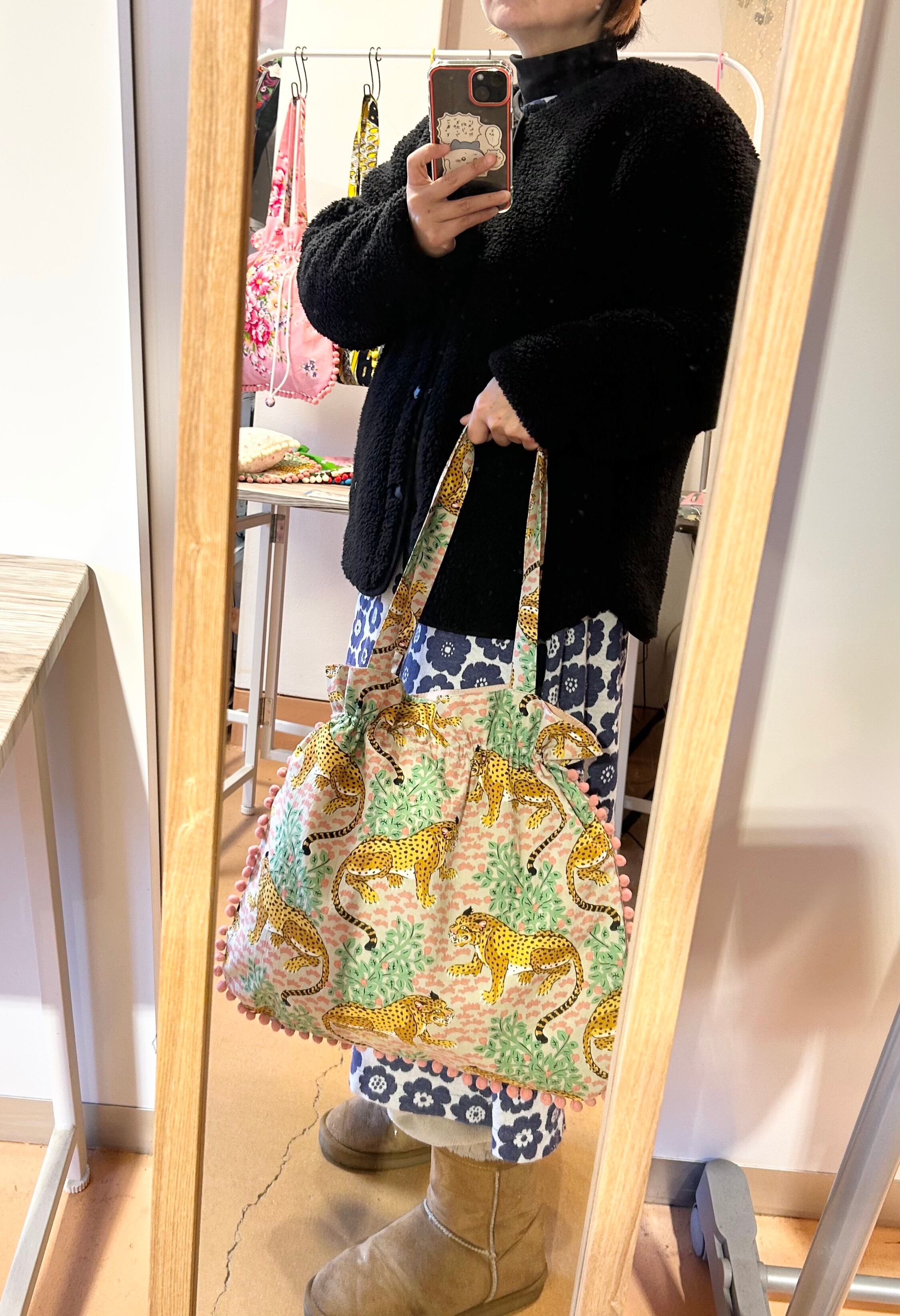 インド綿使用。生地はかなり薄いです。接着芯と裏地を貼ってありますのでそこまで弱くはありませんが、3㎏以上の荷物を入れるには少し強度的に不安があるかもしれません。ご了承ください。