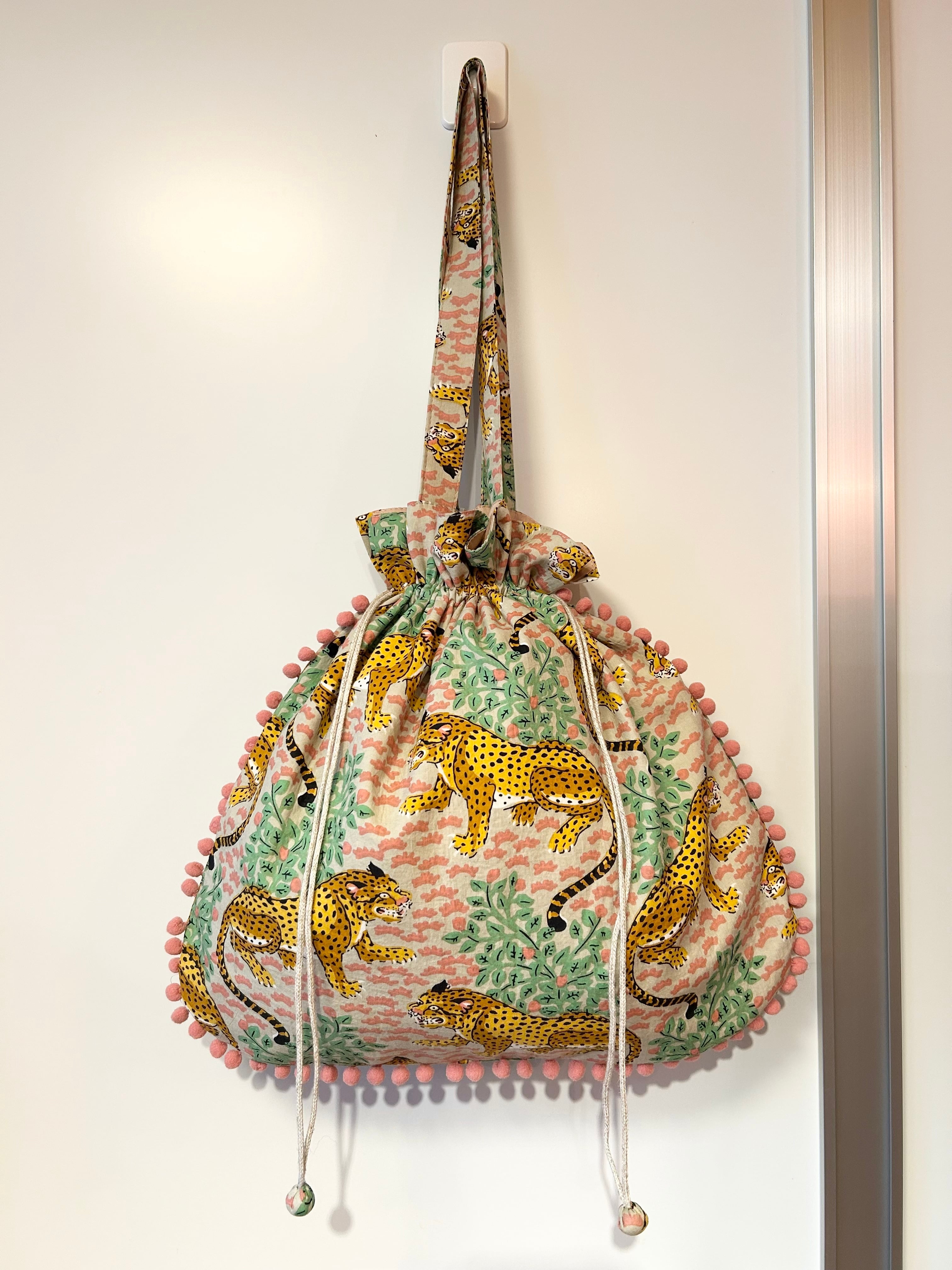 大きめのきんちゃくバッグにポンポンで華やか&大胆にかっこかわいいです。