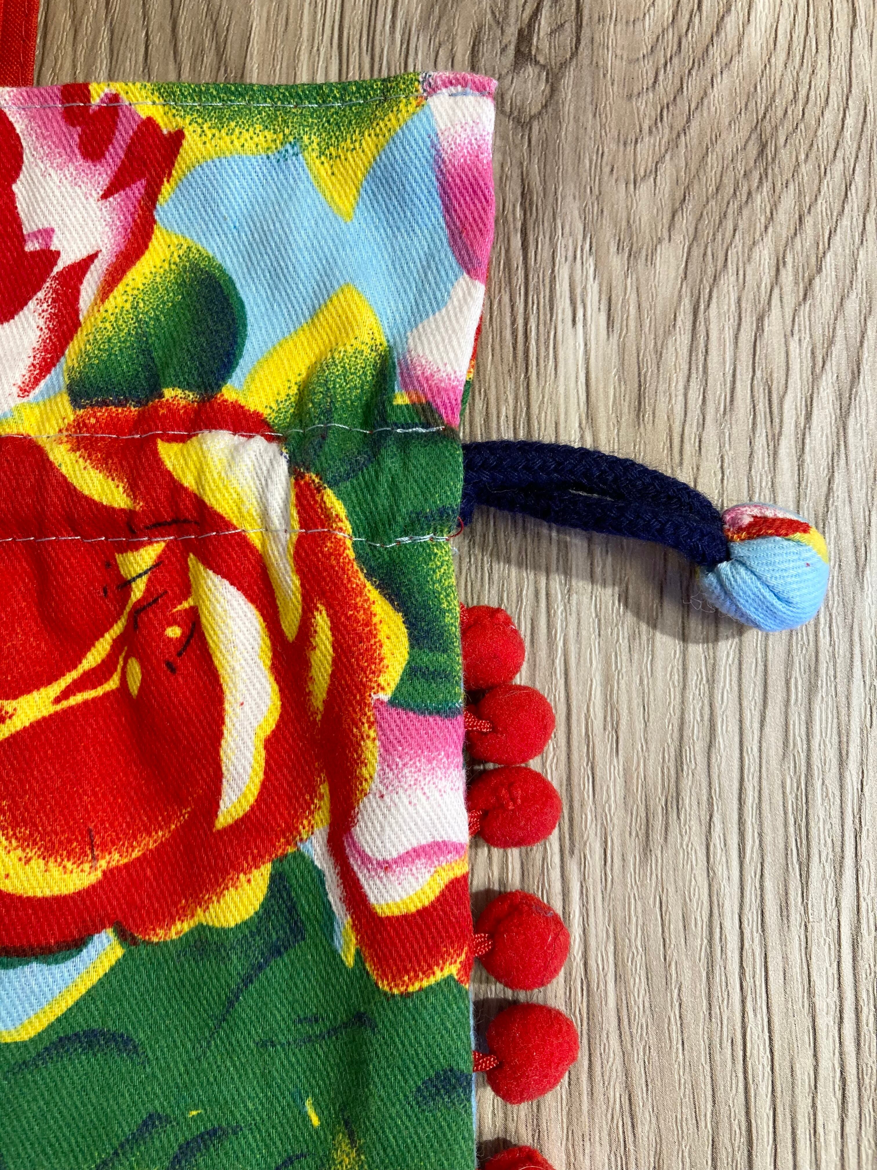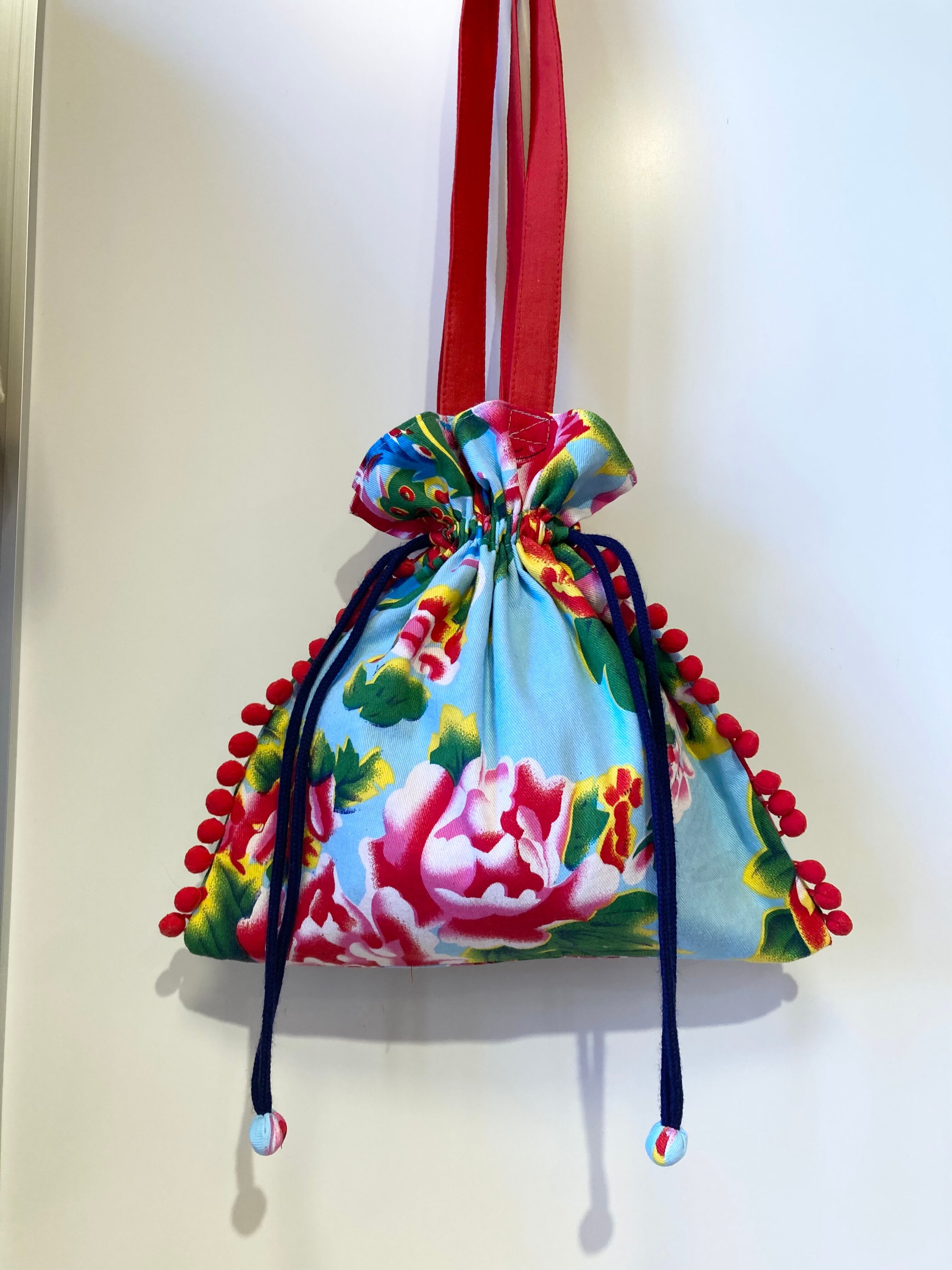 人気のポンポンきんちゃくを外でも持てるように裏地をつけて、大きめに作り、持ち手を付けました。