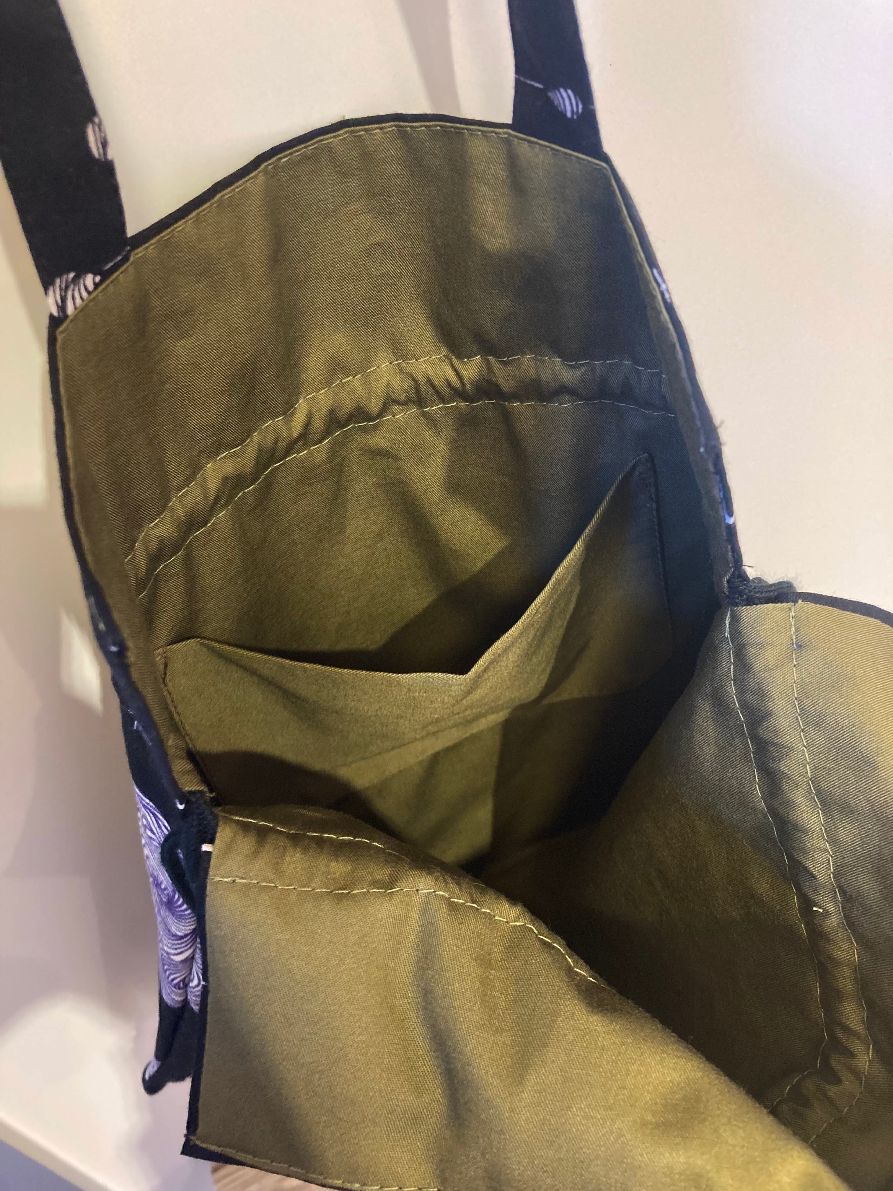 人気のポンポンきんちゃくを外でも持てるように裏地をつけて、大きめに作り、持ち手を付けました。